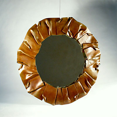The ripple mirror captures the feel of cloth or soft leather in its steel frame. It is available with the brown patina as shown or a number of other finishes.